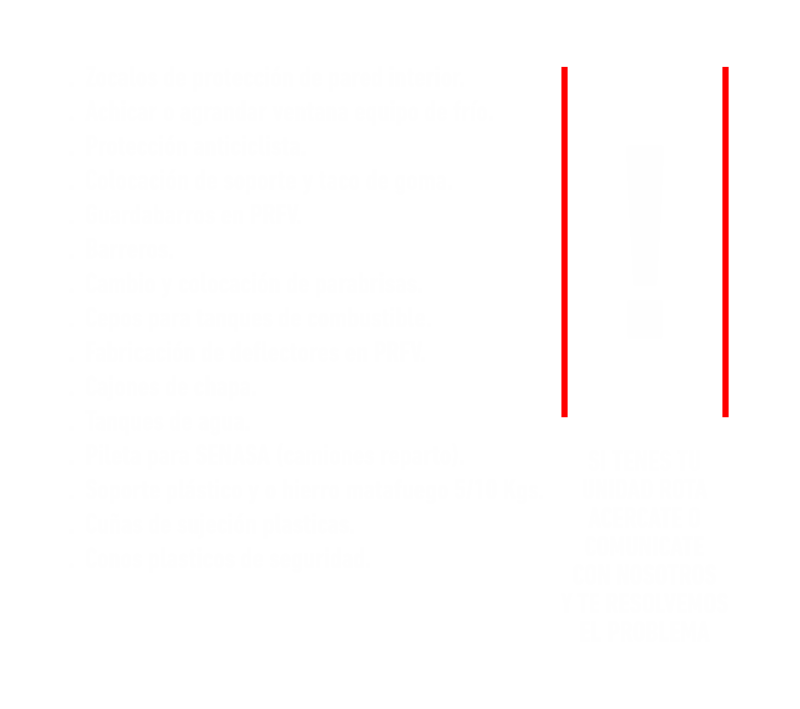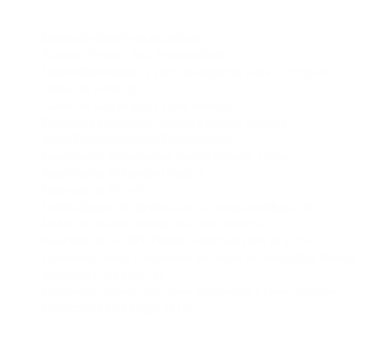 En camiones hacemos, cambios de parabrisas, paragolpes delanteros y traseros, guardabarros, platos de enganche, reparaciones menores de chapa y pintura, (no hacemos trabajos de mecánica).